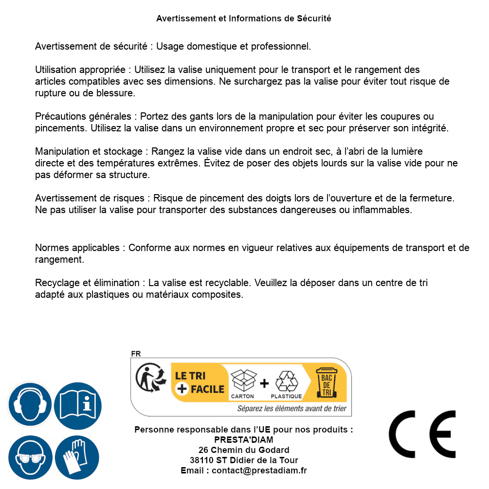| WARNING and SAFETY | Identification de la personne responsable dans l’UE : Nom : PRESTA'DIAM. Adresse : 26 Chemin du Godard, 38110 ST Didier de la Tour (France). Email : contact@prestadiam.fr. |