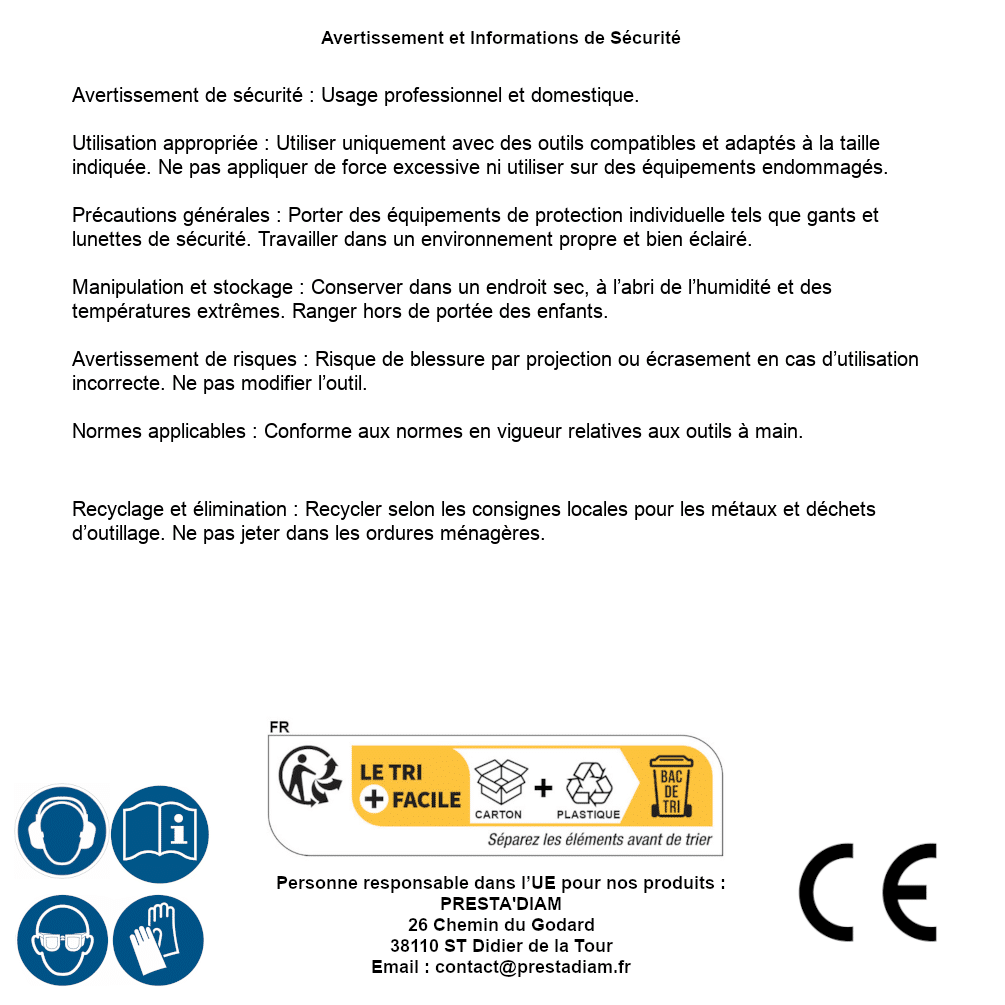 | WARNING and SAFETY | Identification de la personne responsable dans l’UE : Nom : PRESTA'DIAM. Adresse : 26 Chemin du Godard, 38110 ST Didier de la Tour (France). Email : contact@prestadiam.fr. |