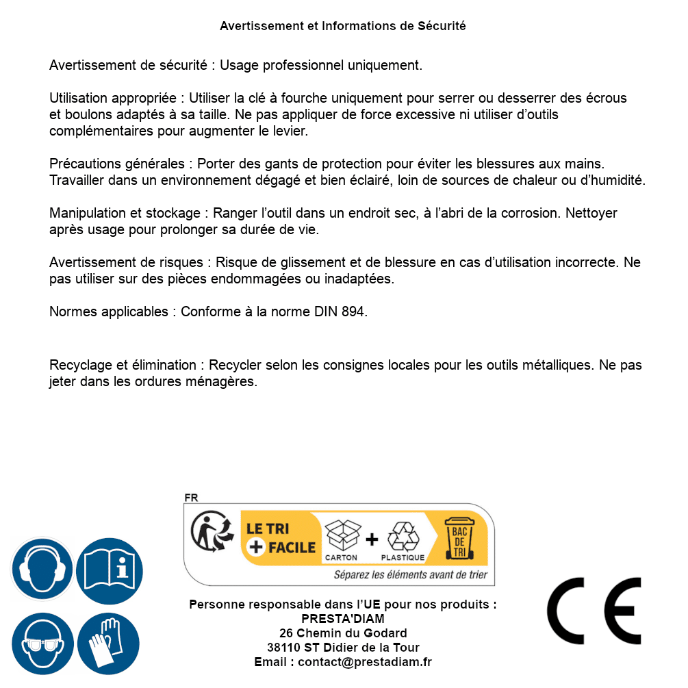 | WARNING and SAFETY | Identification de la personne responsable dans l’UE : Nom : PRESTA'DIAM. Adresse : 26 Chemin du Godard, 38110 ST Didier de la Tour (France). Email : contact@prestadiam.fr. |