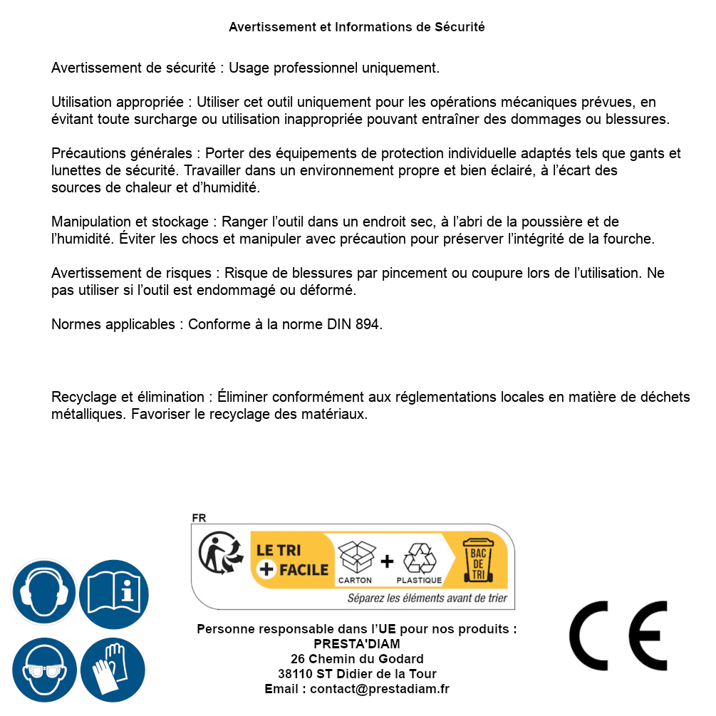 | WARNING and SAFETY | Identification de la personne responsable dans l’UE : Nom : PRESTA'DIAM. Adresse : 26 Chemin du Godard, 38110 ST Didier de la Tour (France). Email : contact@prestadiam.fr. |