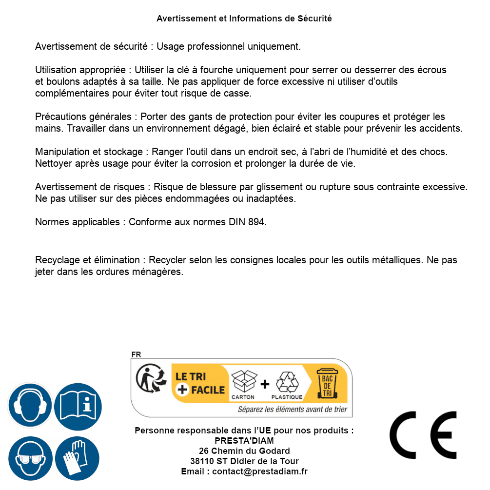 | WARNING and SAFETY | Identification de la personne responsable dans l’UE : Nom : PRESTA'DIAM. Adresse : 26 Chemin du Godard, 38110 ST Didier de la Tour (France). Email : contact@prestadiam.fr. |