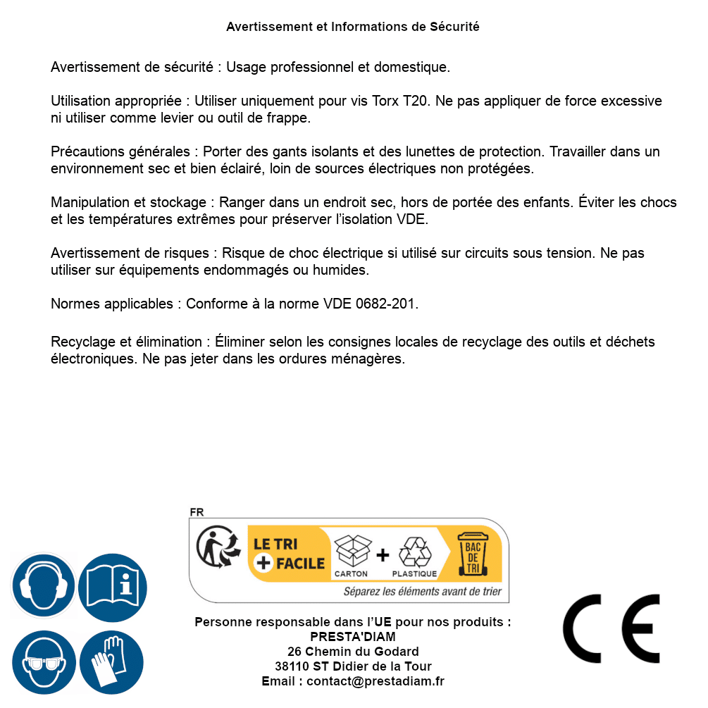 | WARNING and SAFETY | Identification de la personne responsable dans l’UE : Nom : PRESTA'DIAM. Adresse : 26 Chemin du Godard, 38110 ST Didier de la Tour (France). Email : contact@prestadiam.fr. |