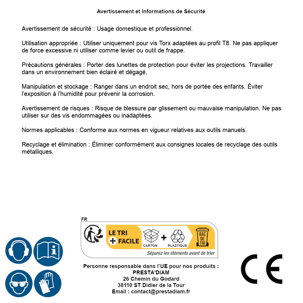| WARNING and SAFETY | Identification de la personne responsable dans l’UE : Nom : PRESTA'DIAM. Adresse : 26 Chemin du Godard, 38110 ST Didier de la Tour (France). Email : contact@prestadiam.fr. |