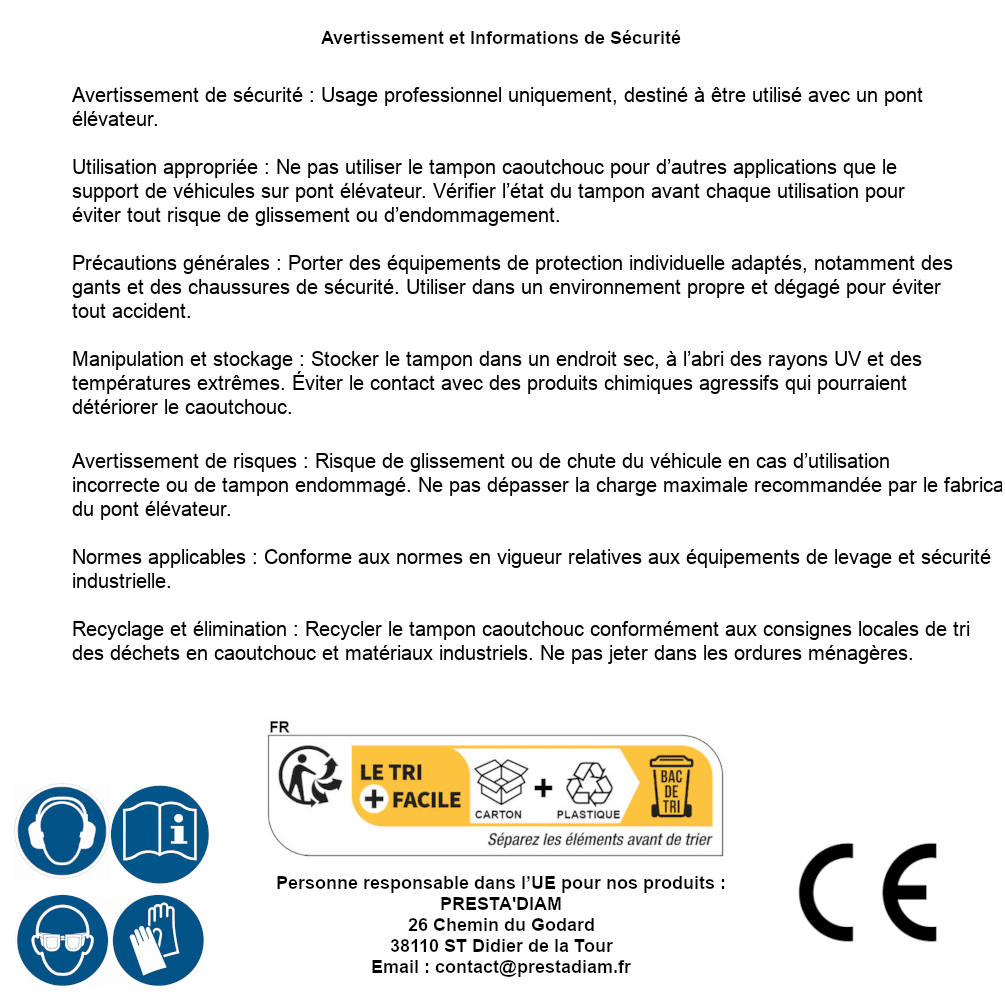 | WARNING and SAFETY | Identification de la personne responsable dans l’UE : Nom : PRESTA'DIAM. Adresse : 26 Chemin du Godard, 38110 ST Didier de la Tour (France). Email : contact@prestadiam.fr. |