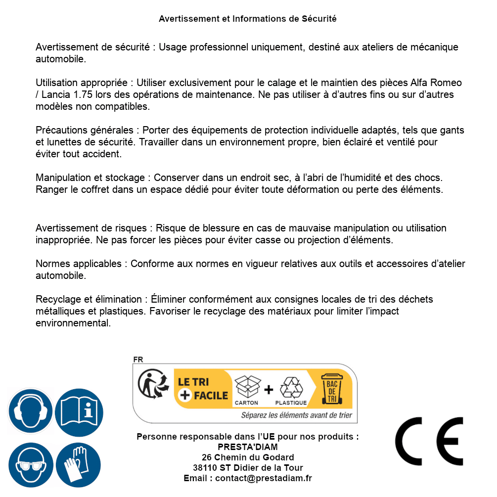 | WARNING and SAFETY | Identification de la personne responsable dans l’UE : Nom : PRESTA'DIAM. Adresse : 26 Chemin du Godard, 38110 ST Didier de la Tour (France). Email : contact@prestadiam.fr. |