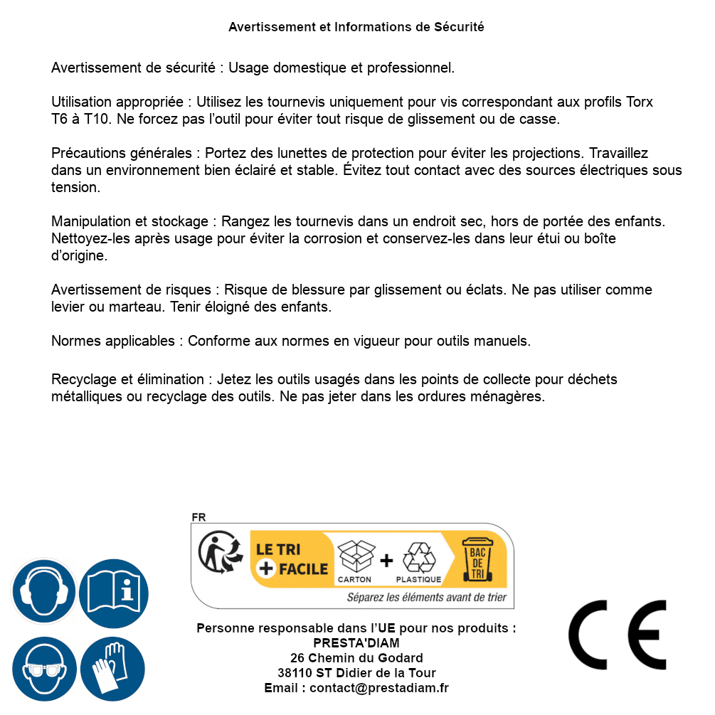 | WARNING and SAFETY | Identification de la personne responsable dans l’UE : Nom : PRESTA'DIAM. Adresse : 26 Chemin du Godard, 38110 ST Didier de la Tour (France). Email : contact@prestadiam.fr. |