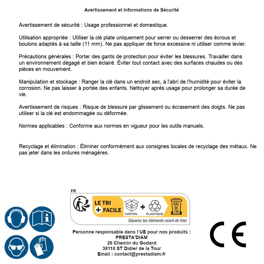 | WARNING and SAFETY | Identification de la personne responsable dans l’UE : Nom : PRESTA'DIAM. Adresse : 26 Chemin du Godard, 38110 ST Didier de la Tour (France). Email : contact@prestadiam.fr. |