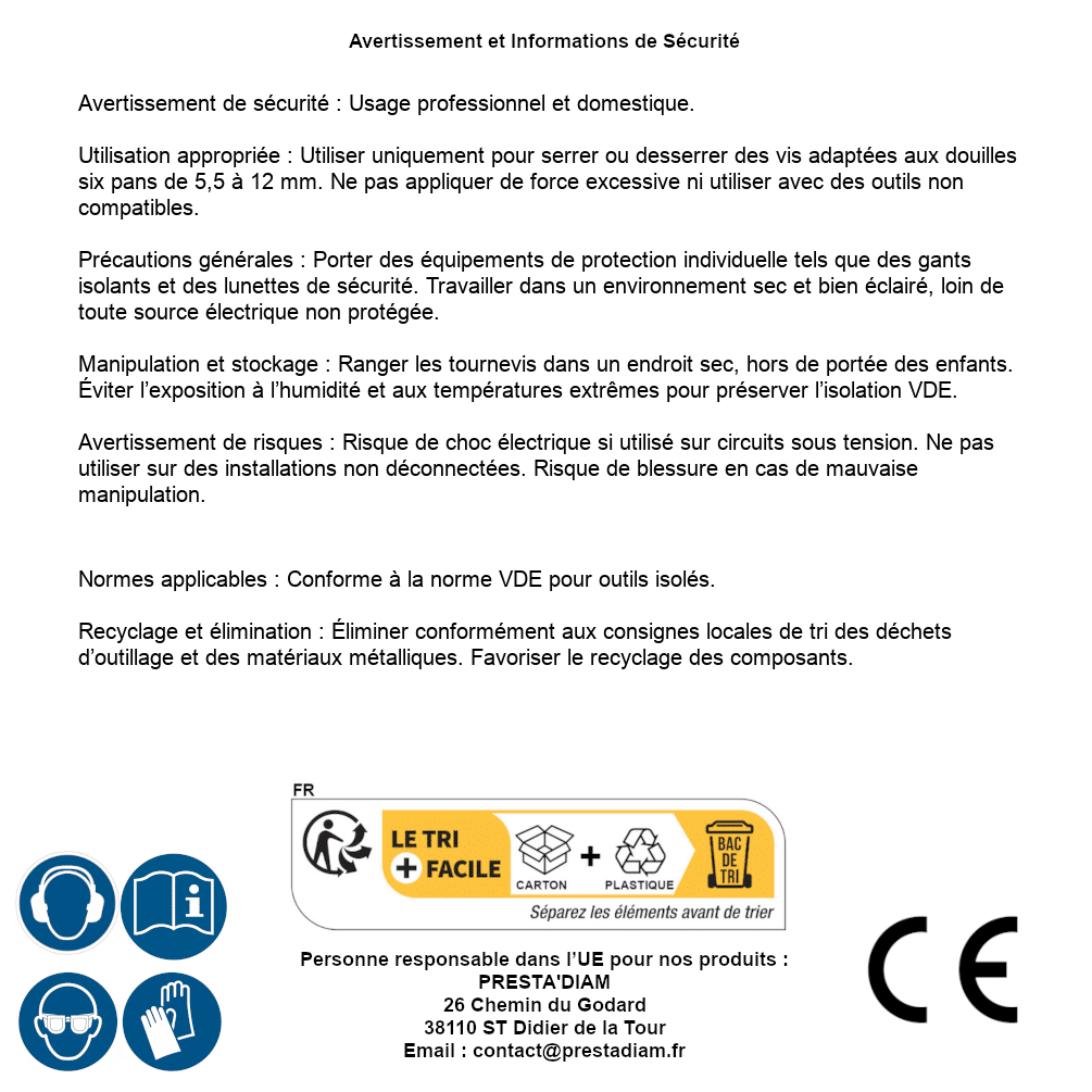 | WARNING and SAFETY | Identification de la personne responsable dans l’UE : Nom : PRESTA'DIAM. Adresse : 26 Chemin du Godard, 38110 ST Didier de la Tour (France). Email : contact@prestadiam.fr. |