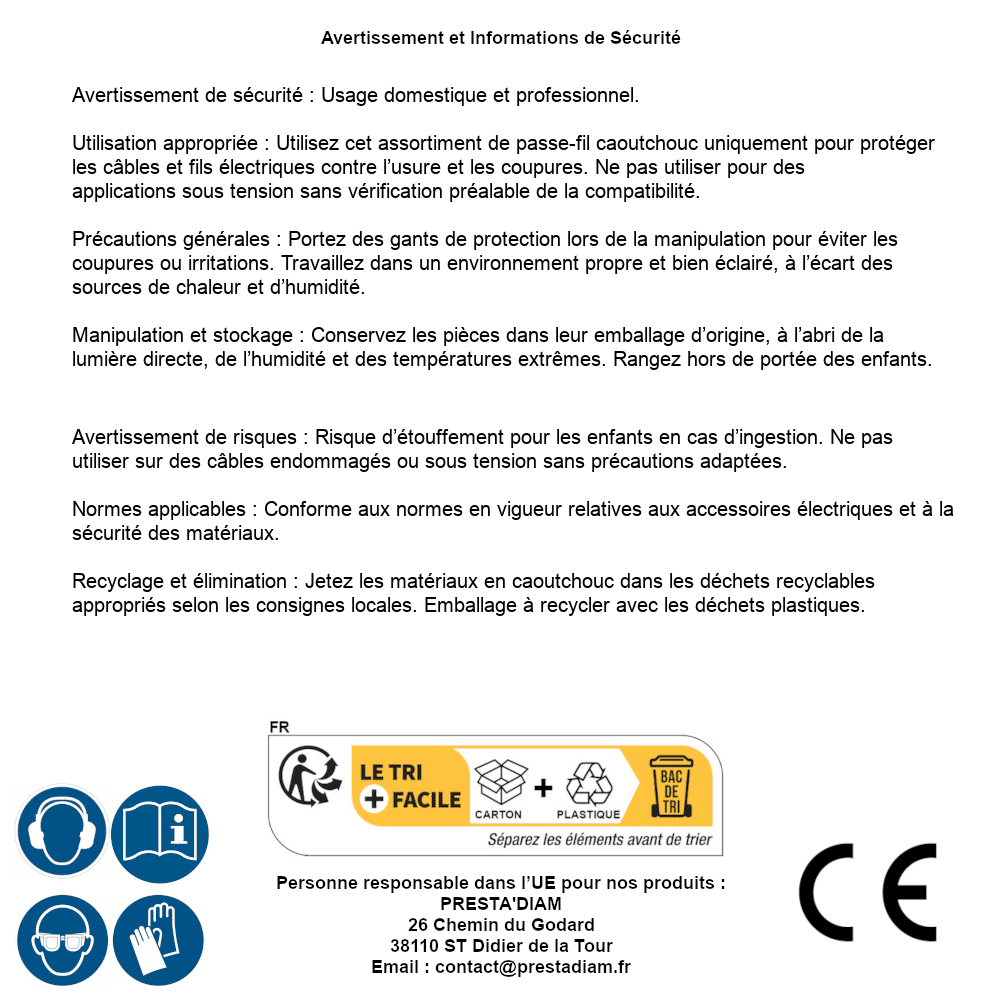 | WARNING and SAFETY | Identification de la personne responsable dans l’UE : Nom : PRESTA'DIAM. Adresse : 26 Chemin du Godard, 38110 ST Didier de la Tour (France). Email : contact@prestadiam.fr. |