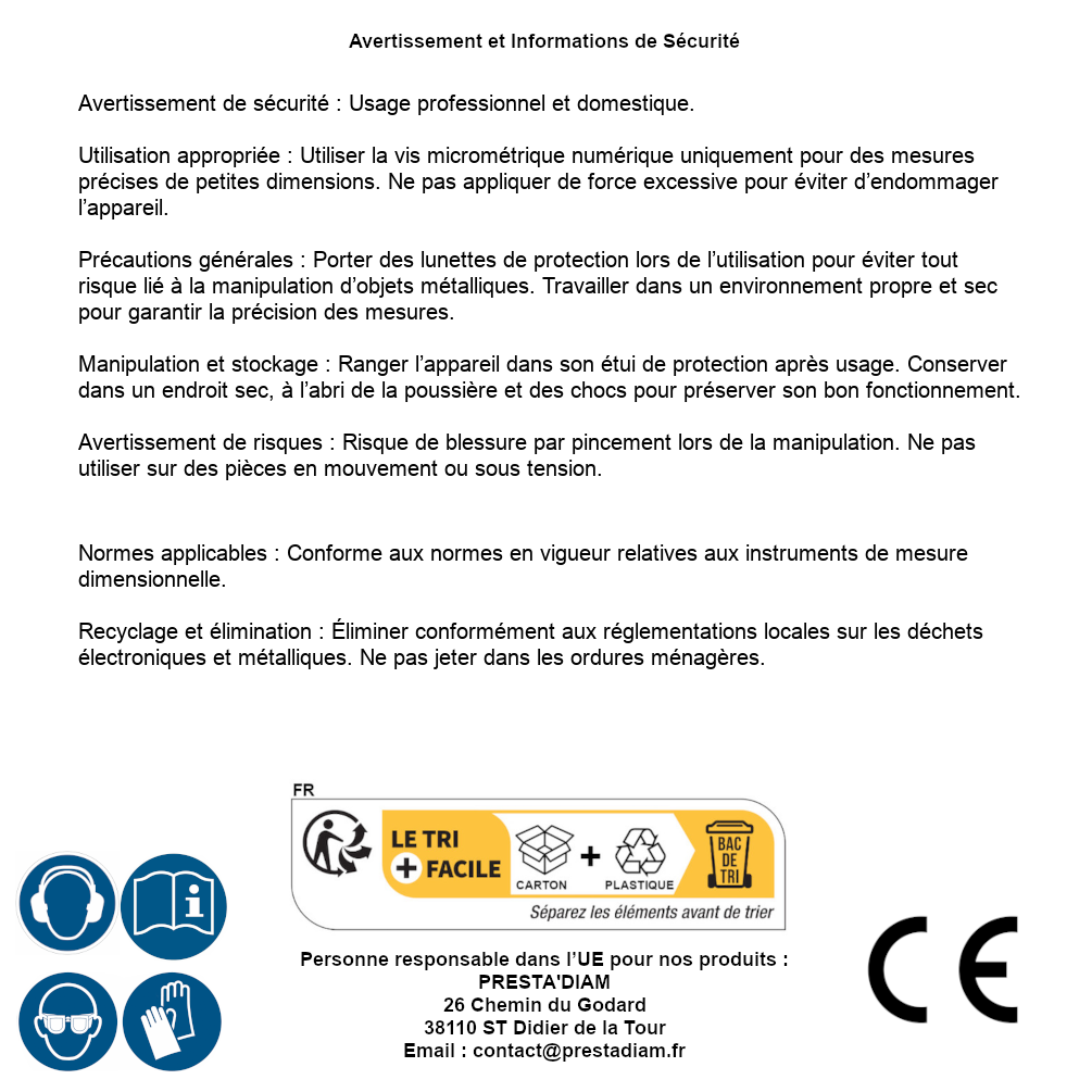 | WARNING and SAFETY | Identification de la personne responsable dans l’UE : Nom : PRESTA'DIAM. Adresse : 26 Chemin du Godard, 38110 ST Didier de la Tour (France). Email : contact@prestadiam.fr. |