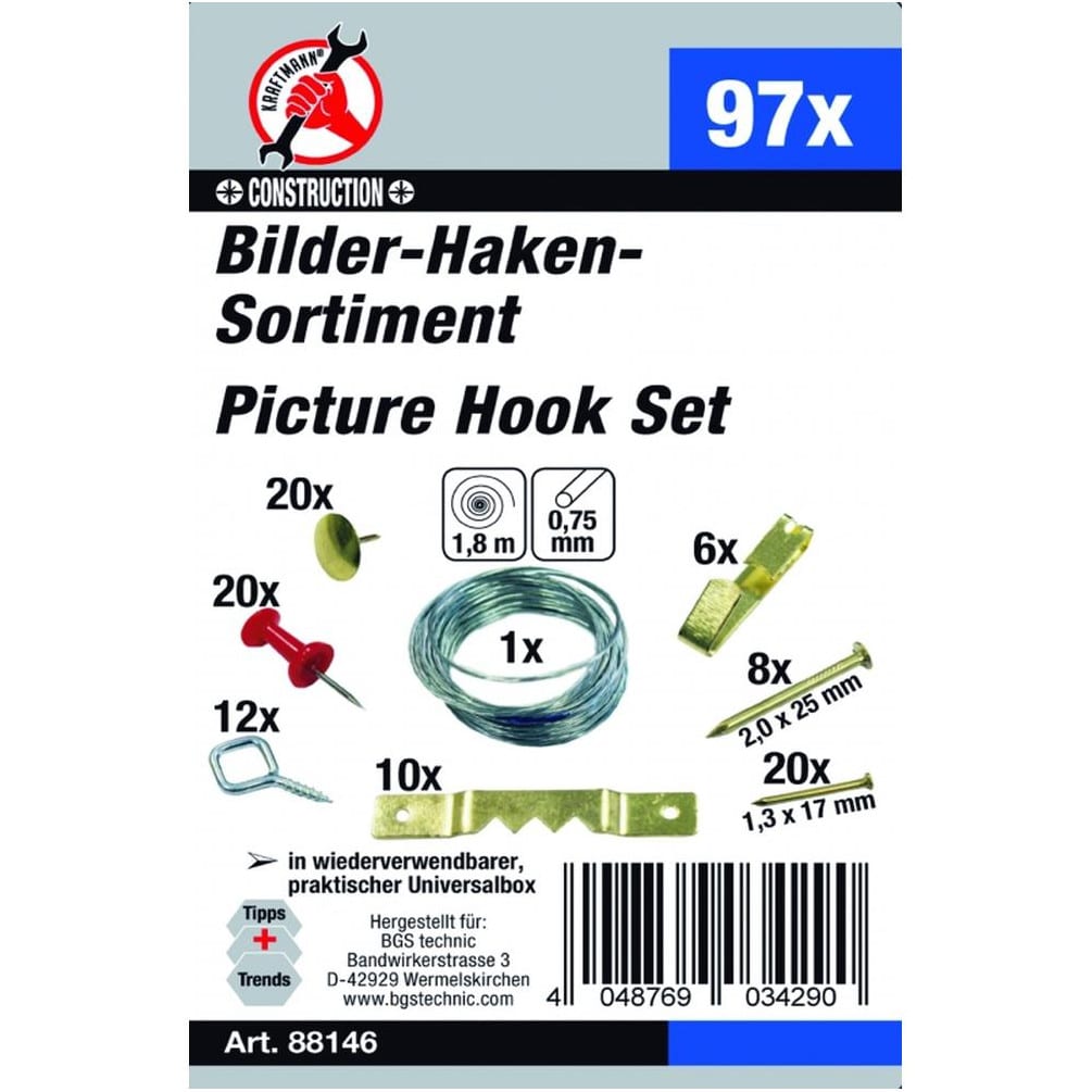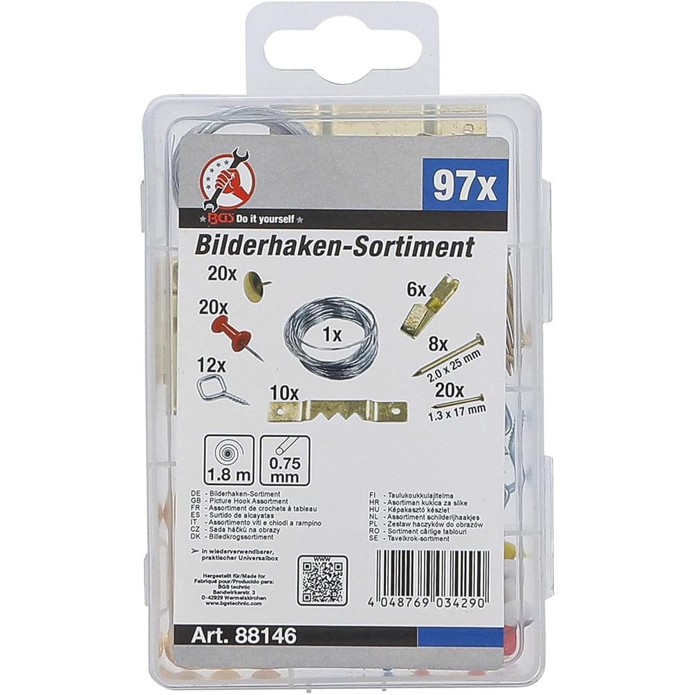 Assortiment de Crochets à Tableau 97 Pièces - Acier, Multicolore - Fixation Facile et Polyvalente - BGS