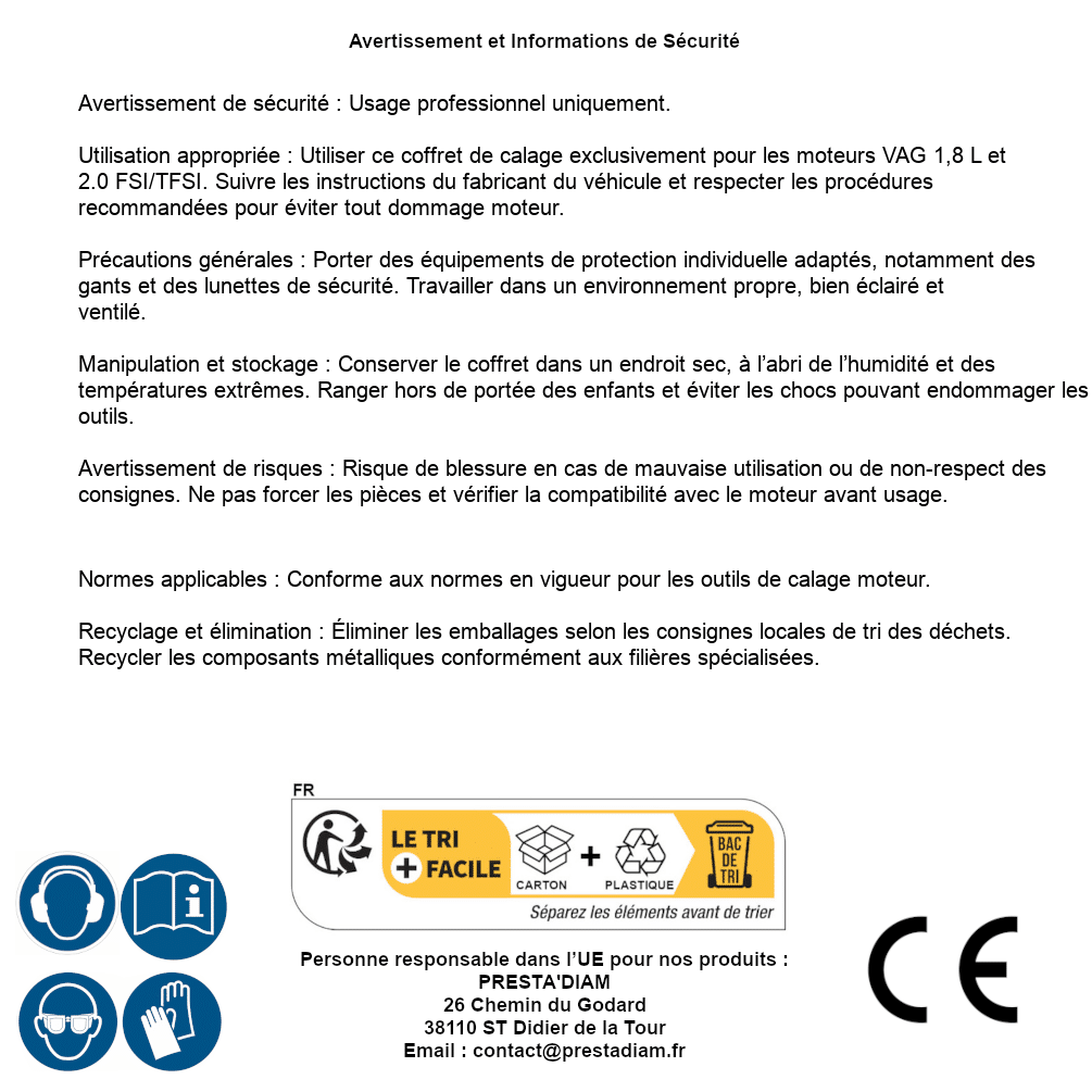 | WARNING and SAFETY | Identification de la personne responsable dans l’UE : Nom : PRESTA'DIAM. Adresse : 26 Chemin du Godard, 38110 ST Didier de la Tour (France). Email : contact@prestadiam.fr. |