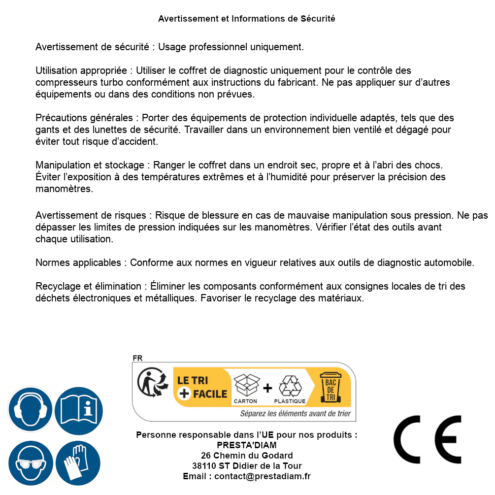 | WARNING and SAFETY | Identification de la personne responsable dans l’UE : Nom : PRESTA'DIAM. Adresse : 26 Chemin du Godard, 38110 ST Didier de la Tour (France). Email : contact@prestadiam.fr. |