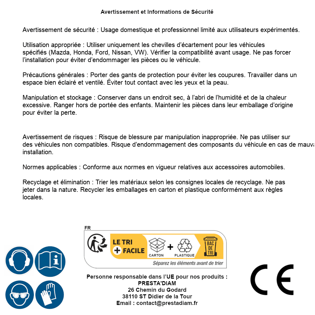| WARNING and SAFETY | Identification de la personne responsable dans l’UE : Nom : PRESTA'DIAM. Adresse : 26 Chemin du Godard, 38110 ST Didier de la Tour (France). Email : contact@prestadiam.fr. |