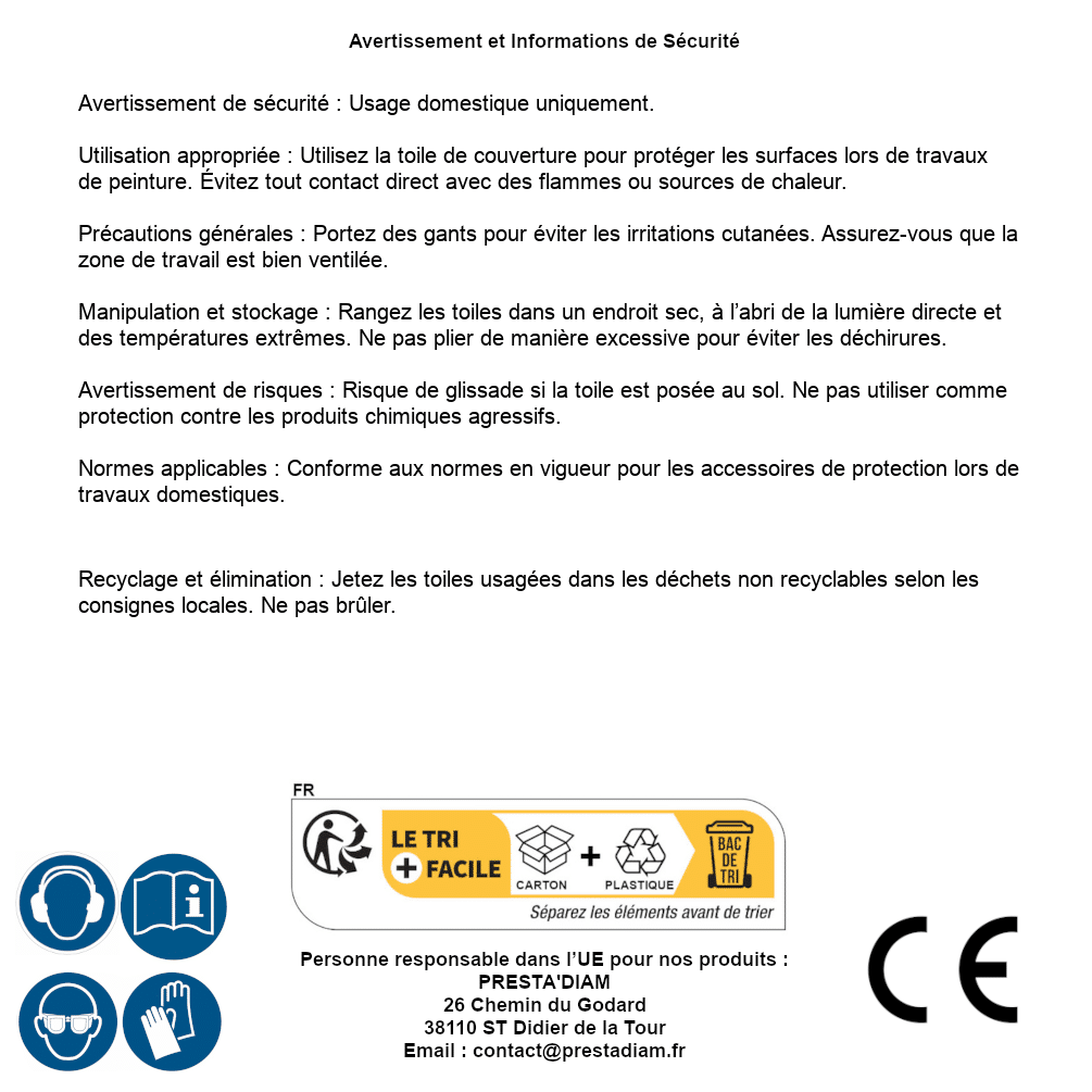 | WARNING and SAFETY | Identification de la personne responsable dans l’UE : Nom : PRESTA'DIAM. Adresse : 26 Chemin du Godard, 38110 ST Didier de la Tour (France). Email : contact@prestadiam.fr. |