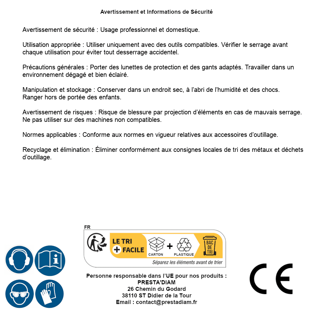 | WARNING and SAFETY | Identification de la personne responsable dans l’UE : Nom : PRESTA'DIAM. Adresse : 26 Chemin du Godard, 38110 ST Didier de la Tour (France). Email : contact@prestadiam.fr. |