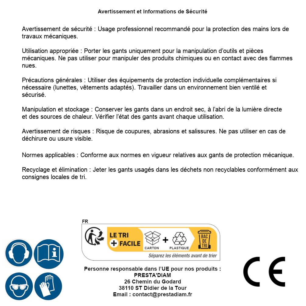 | WARNING and SAFETY | Identification de la personne responsable dans l’UE : Nom : PRESTA'DIAM. Adresse : 26 Chemin du Godard, 38110 ST Didier de la Tour (France). Email : contact@prestadiam.fr. |