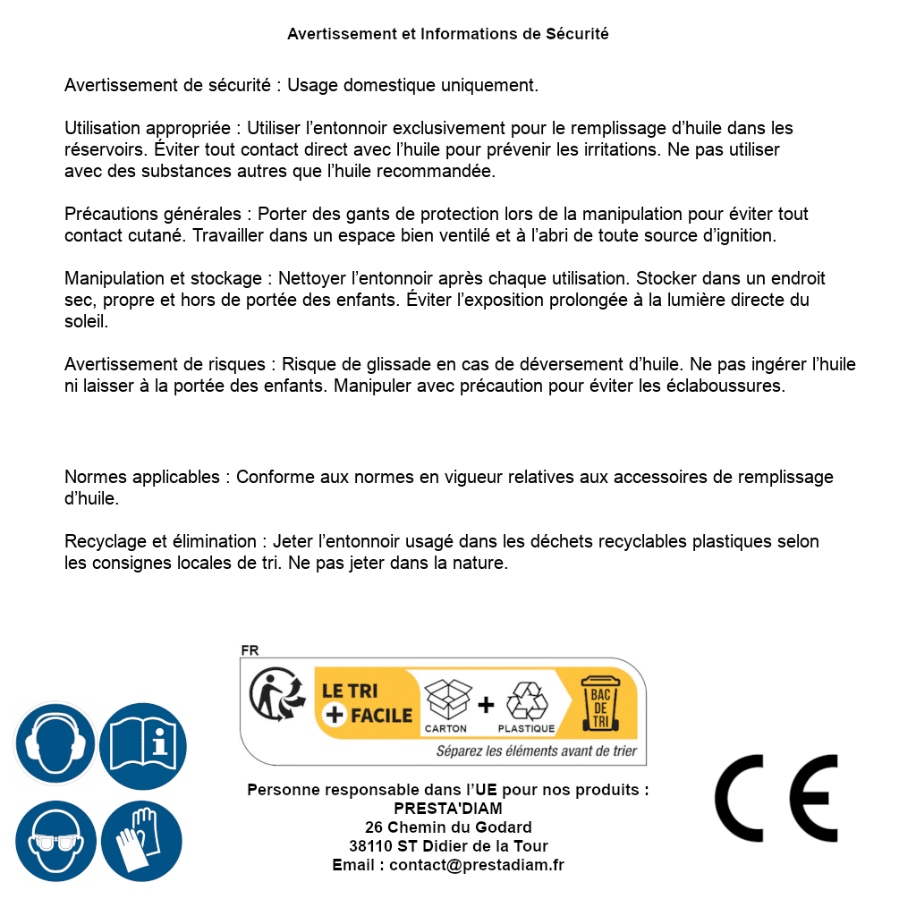 | WARNING and SAFETY | Identification de la personne responsable dans l’UE : Nom : PRESTA'DIAM. Adresse : 26 Chemin du Godard, 38110 ST Didier de la Tour (France). Email : contact@prestadiam.fr. |