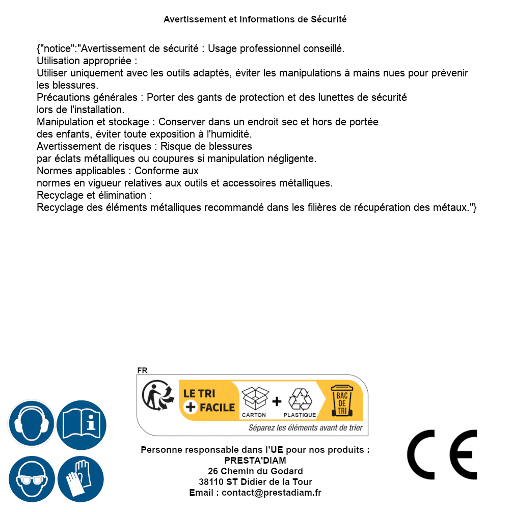 | WARNING and SAFETY | Identification de la personne responsable dans l’UE : Nom : PRESTA'DIAM. Adresse : 26 Chemin du Godard, 38110 ST Didier de la Tour (France). Email : contact@prestadiam.fr. |