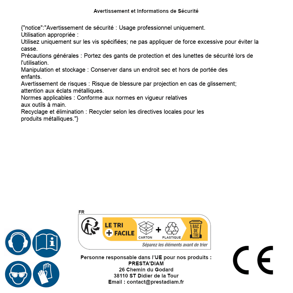 | WARNING and SAFETY | Identification de la personne responsable dans l’UE : Nom : PRESTA'DIAM. Adresse : 26 Chemin du Godard, 38110 ST Didier de la Tour (France). Email : contact@prestadiam.fr. |