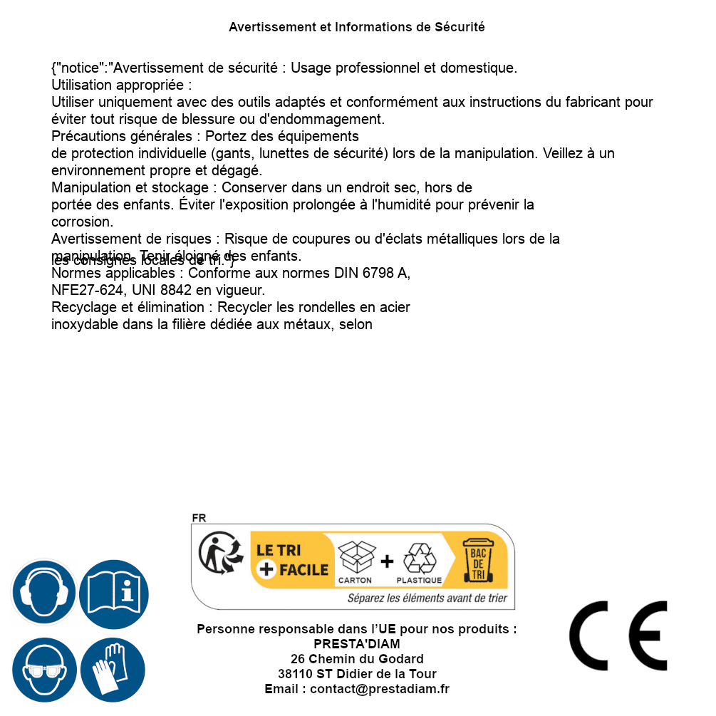 | WARNING and SAFETY | Identification de la personne responsable dans l’UE : Nom : PRESTA'DIAM. Adresse : 26 Chemin du Godard, 38110 ST Didier de la Tour (France). Email : contact@prestadiam.fr. |