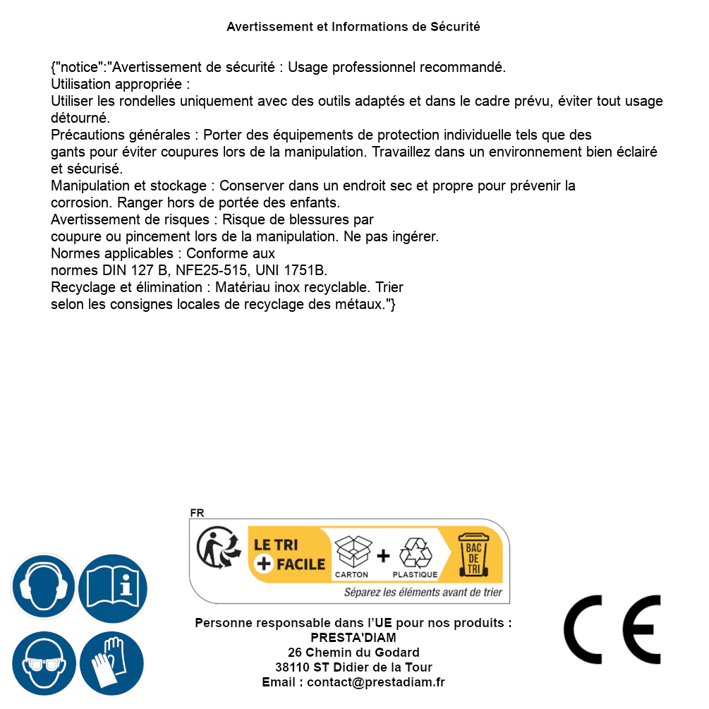 | WARNING and SAFETY | Identification de la personne responsable dans l’UE : Nom : PRESTA'DIAM. Adresse : 26 Chemin du Godard, 38110 ST Didier de la Tour (France). Email : contact@prestadiam.fr. |