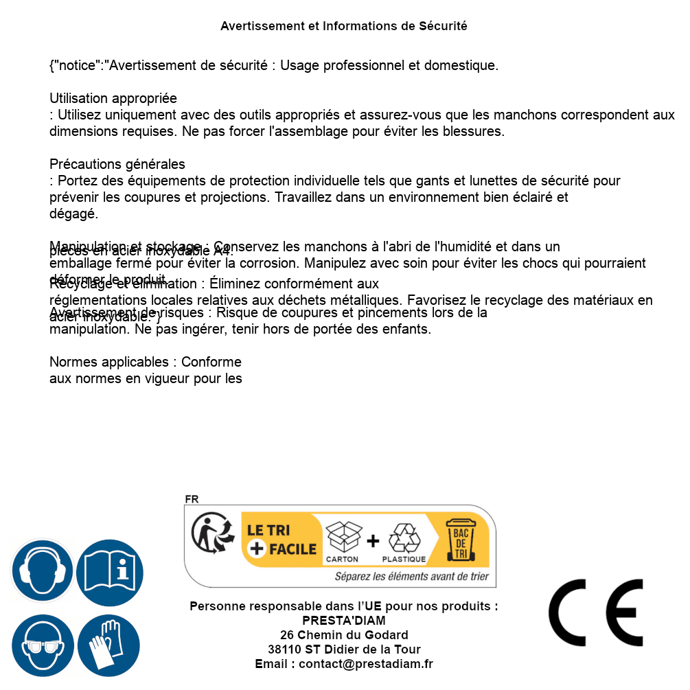 | WARNING and SAFETY | Identification de la personne responsable dans l’UE : Nom : PRESTA'DIAM. Adresse : 26 Chemin du Godard, 38110 ST Didier de la Tour (France). Email : contact@prestadiam.fr. |