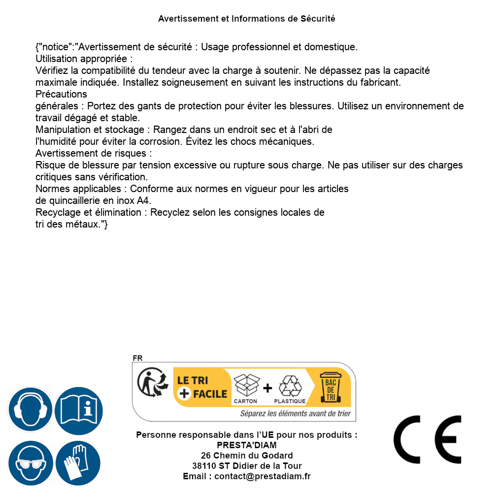 | WARNING and SAFETY | Identification de la personne responsable dans l’UE : Nom : PRESTA'DIAM. Adresse : 26 Chemin du Godard, 38110 ST Didier de la Tour (France). Email : contact@prestadiam.fr. |