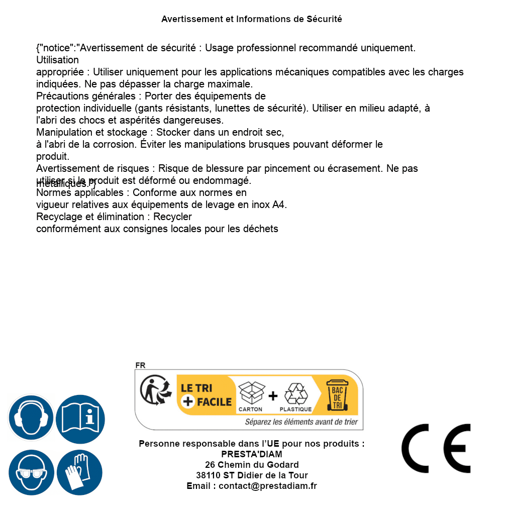 | WARNING and SAFETY | Identification de la personne responsable dans l’UE : Nom : PRESTA'DIAM. Adresse : 26 Chemin du Godard, 38110 ST Didier de la Tour (France). Email : contact@prestadiam.fr. |