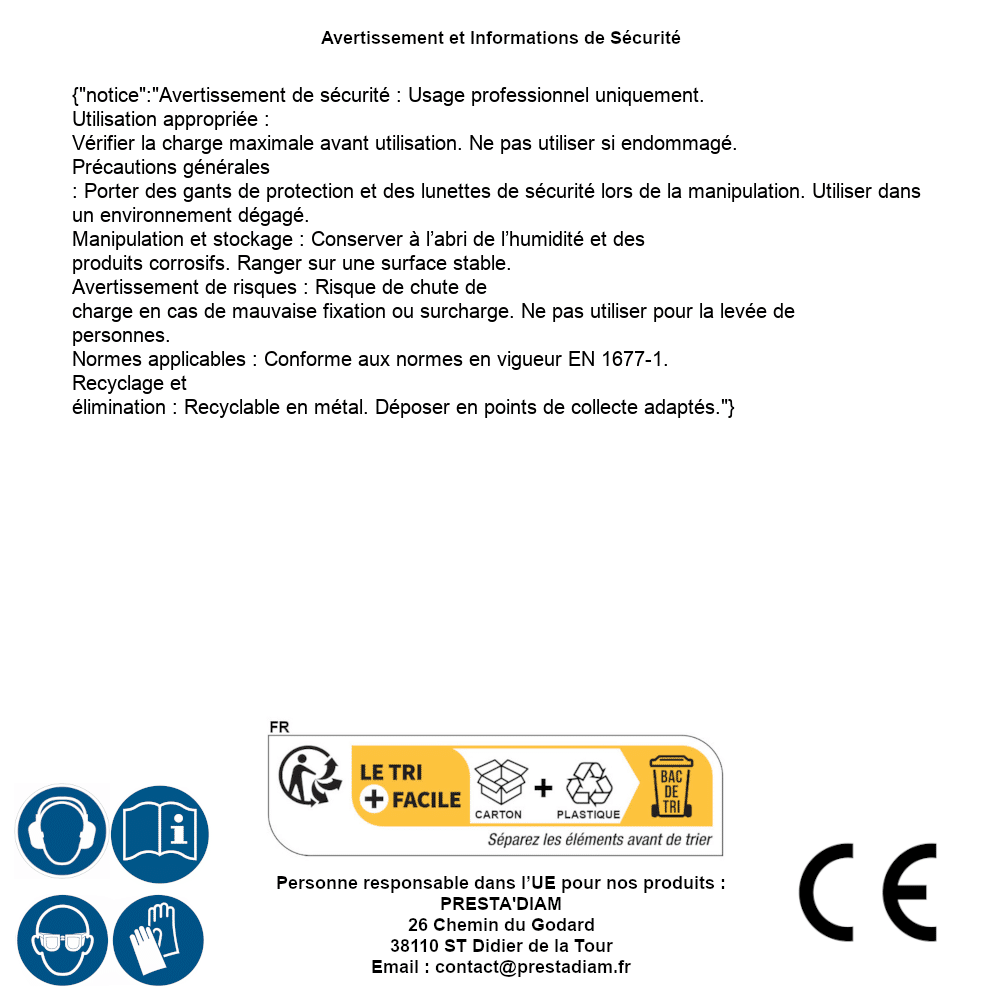 | WARNING and SAFETY | Identification de la personne responsable dans l’UE : Nom : PRESTA'DIAM. Adresse : 26 Chemin du Godard, 38110 ST Didier de la Tour (France). Email : contact@prestadiam.fr. |