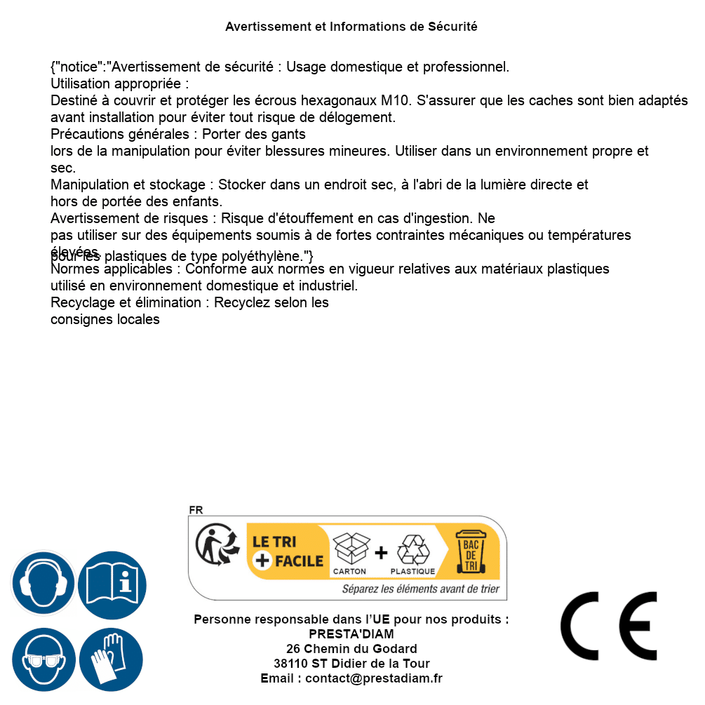 | WARNING and SAFETY | Identification de la personne responsable dans l’UE : Nom : PRESTA'DIAM. Adresse : 26 Chemin du Godard, 38110 ST Didier de la Tour (France). Email : contact@prestadiam.fr. |