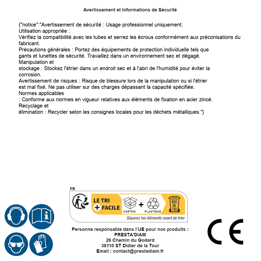 | WARNING and SAFETY | Identification de la personne responsable dans l’UE : Nom : PRESTA'DIAM. Adresse : 26 Chemin du Godard, 38110 ST Didier de la Tour (France). Email : contact@prestadiam.fr. |