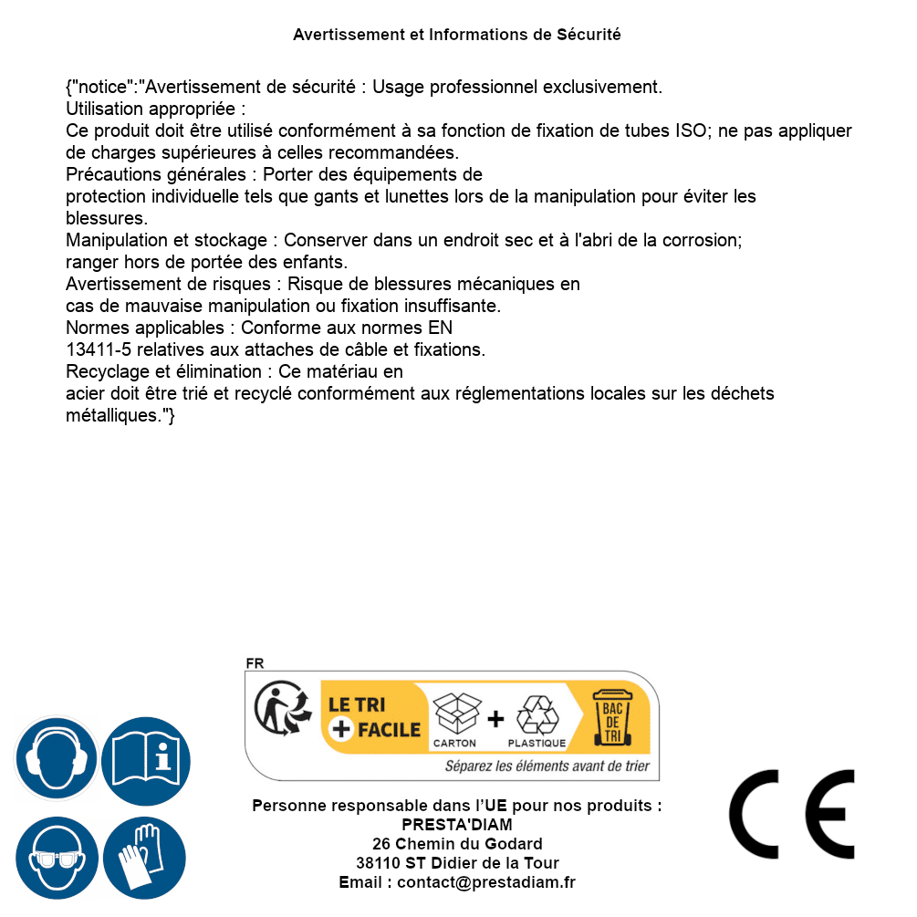 | WARNING and SAFETY | Identification de la personne responsable dans l’UE : Nom : PRESTA'DIAM. Adresse : 26 Chemin du Godard, 38110 ST Didier de la Tour (France). Email : contact@prestadiam.fr. |