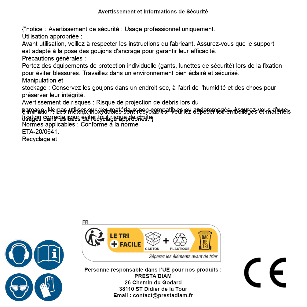 | WARNING and SAFETY | Identification de la personne responsable dans l’UE : Nom : PRESTA'DIAM. Adresse : 26 Chemin du Godard, 38110 ST Didier de la Tour (France). Email : contact@prestadiam.fr. |