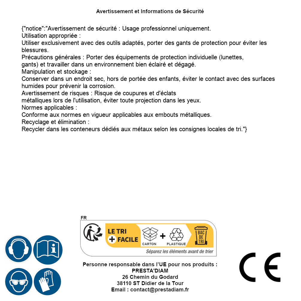 | WARNING and SAFETY | Identification de la personne responsable dans l’UE : Nom : PRESTA'DIAM. Adresse : 26 Chemin du Godard, 38110 ST Didier de la Tour (France). Email : contact@prestadiam.fr. |