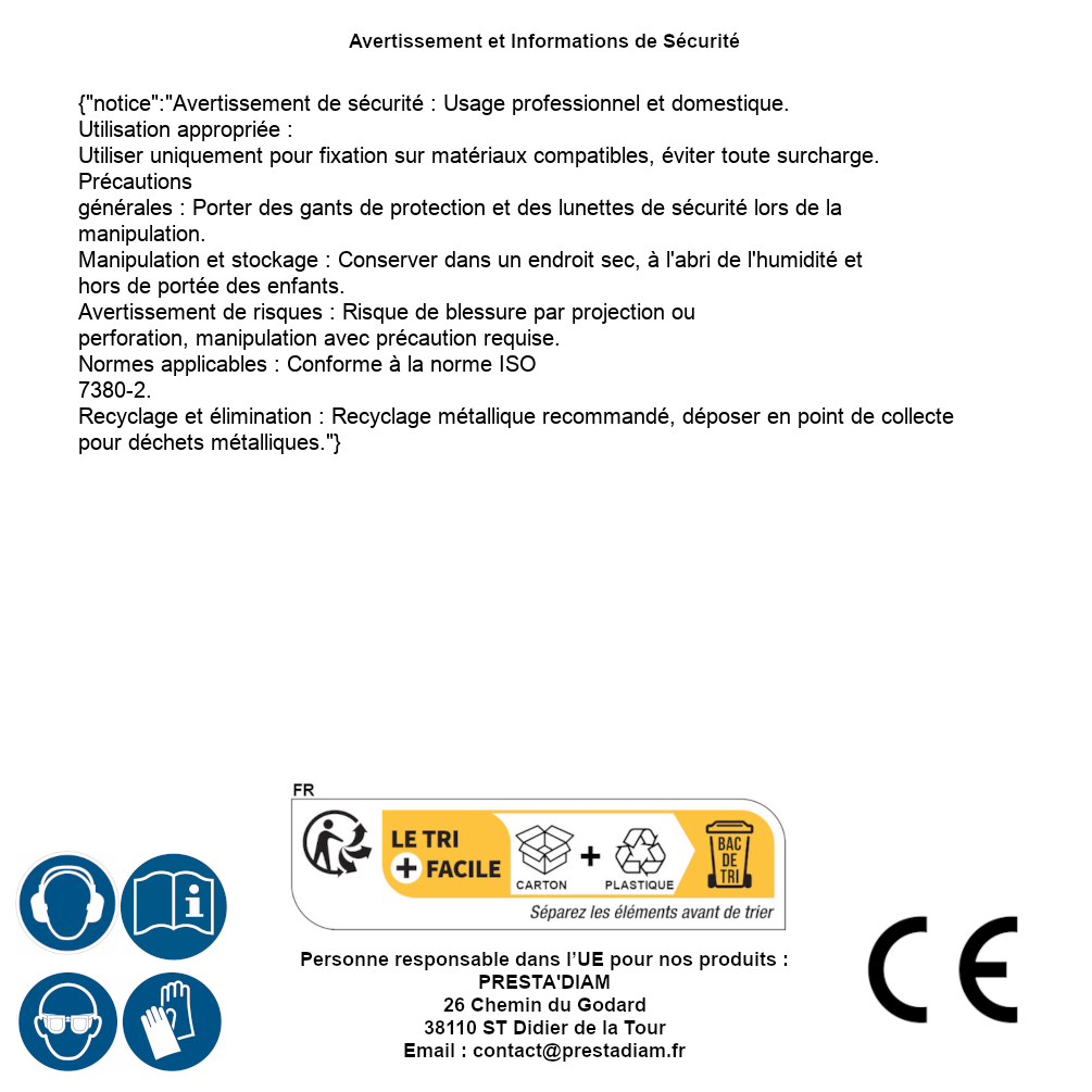 | WARNING and SAFETY | Identification de la personne responsable dans l’UE : Nom : PRESTA'DIAM. Adresse : 26 Chemin du Godard, 38110 ST Didier de la Tour (France). Email : contact@prestadiam.fr. |