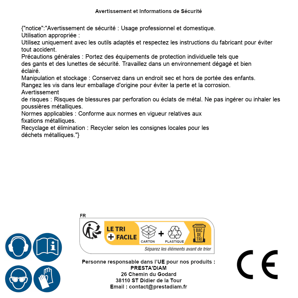 | WARNING and SAFETY | Identification de la personne responsable dans l’UE : Nom : PRESTA'DIAM. Adresse : 26 Chemin du Godard, 38110 ST Didier de la Tour (France). Email : contact@prestadiam.fr. |