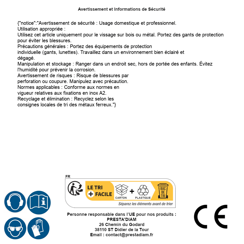 | WARNING and SAFETY | Identification de la personne responsable dans l’UE : Nom : PRESTA'DIAM. Adresse : 26 Chemin du Godard, 38110 ST Didier de la Tour (France). Email : contact@prestadiam.fr. |