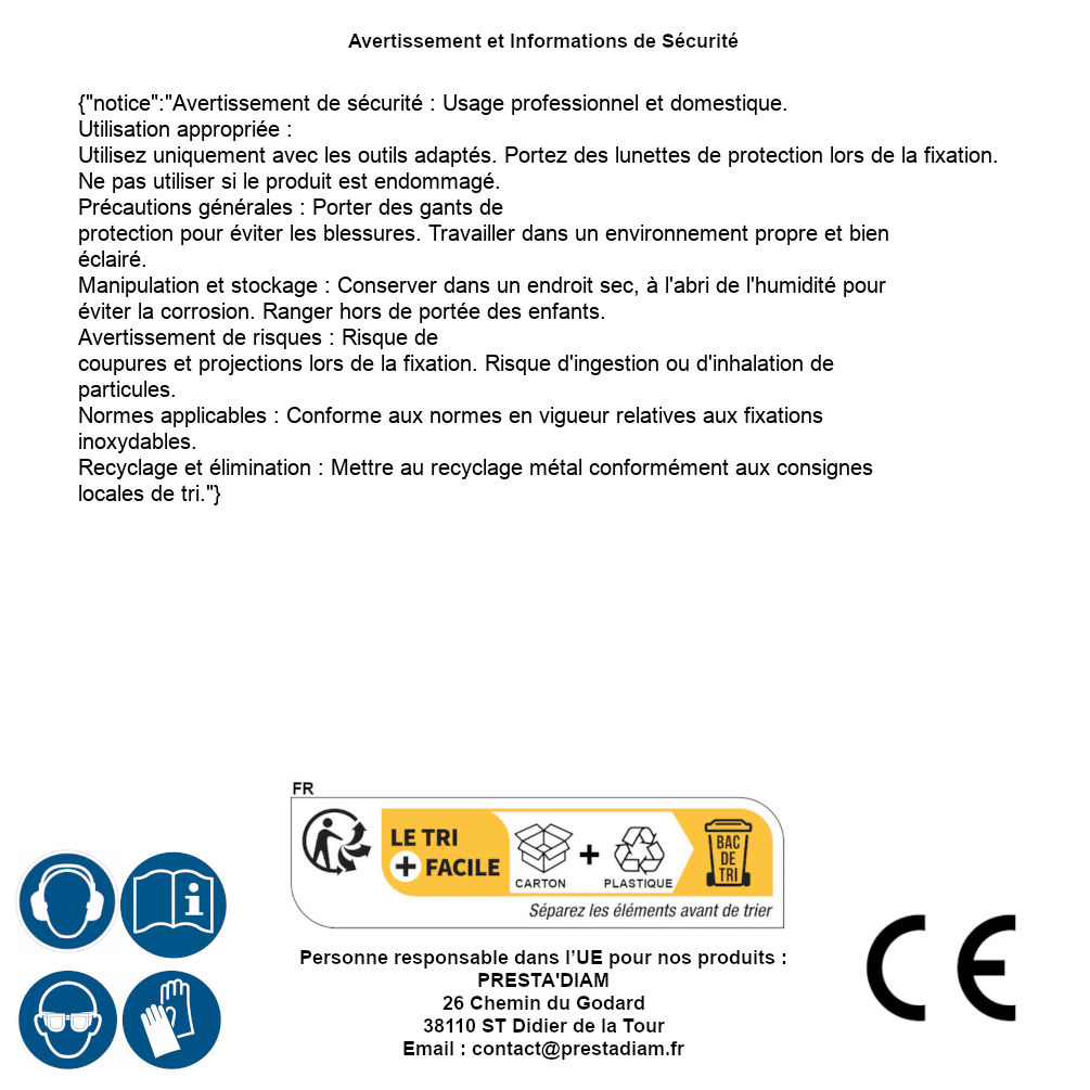 | WARNING and SAFETY | Identification de la personne responsable dans l’UE : Nom : PRESTA'DIAM. Adresse : 26 Chemin du Godard, 38110 ST Didier de la Tour (France). Email : contact@prestadiam.fr. |