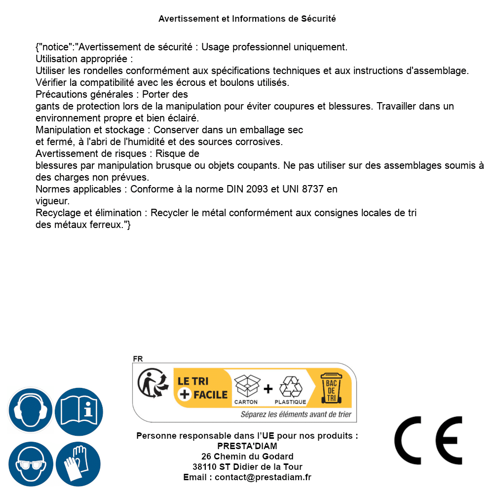 | WARNING and SAFETY | Identification de la personne responsable dans l’UE : Nom : PRESTA'DIAM. Adresse : 26 Chemin du Godard, 38110 ST Didier de la Tour (France). Email : contact@prestadiam.fr. |