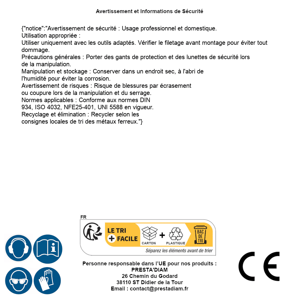 | WARNING and SAFETY | Identification de la personne responsable dans l’UE : Nom : PRESTA'DIAM. Adresse : 26 Chemin du Godard, 38110 ST Didier de la Tour (France). Email : contact@prestadiam.fr. |