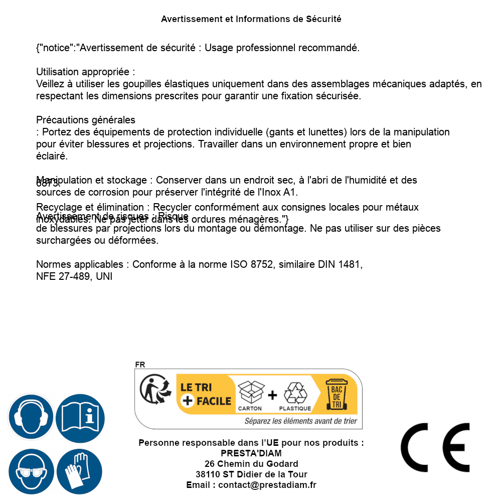 | WARNING and SAFETY | Identification de la personne responsable dans l’UE : Nom : PRESTA'DIAM. Adresse : 26 Chemin du Godard, 38110 ST Didier de la Tour (France). Email : contact@prestadiam.fr. |