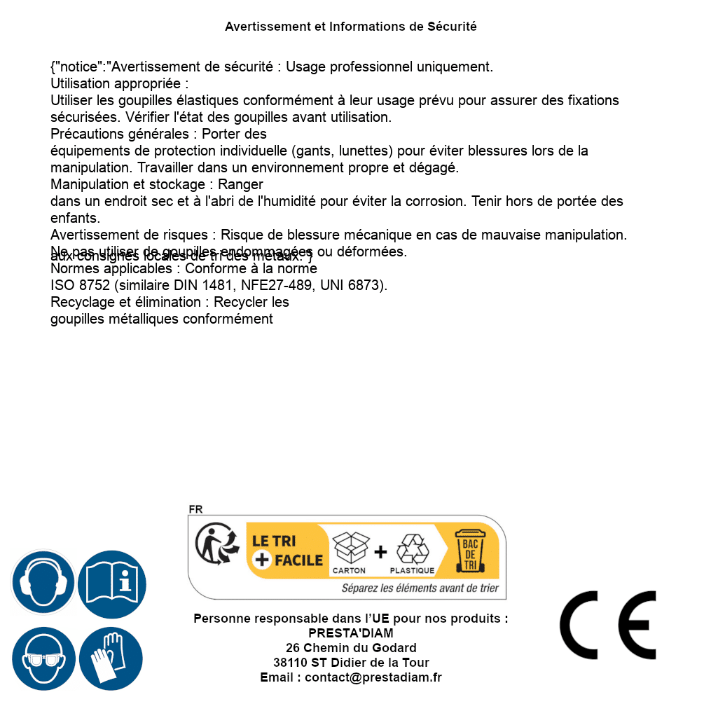 | WARNING and SAFETY | Identification de la personne responsable dans l’UE : Nom : PRESTA'DIAM. Adresse : 26 Chemin du Godard, 38110 ST Didier de la Tour (France). Email : contact@prestadiam.fr. |