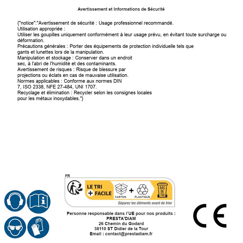 | WARNING and SAFETY | Identification de la personne responsable dans l’UE : Nom : PRESTA'DIAM. Adresse : 26 Chemin du Godard, 38110 ST Didier de la Tour (France). Email : contact@prestadiam.fr. |