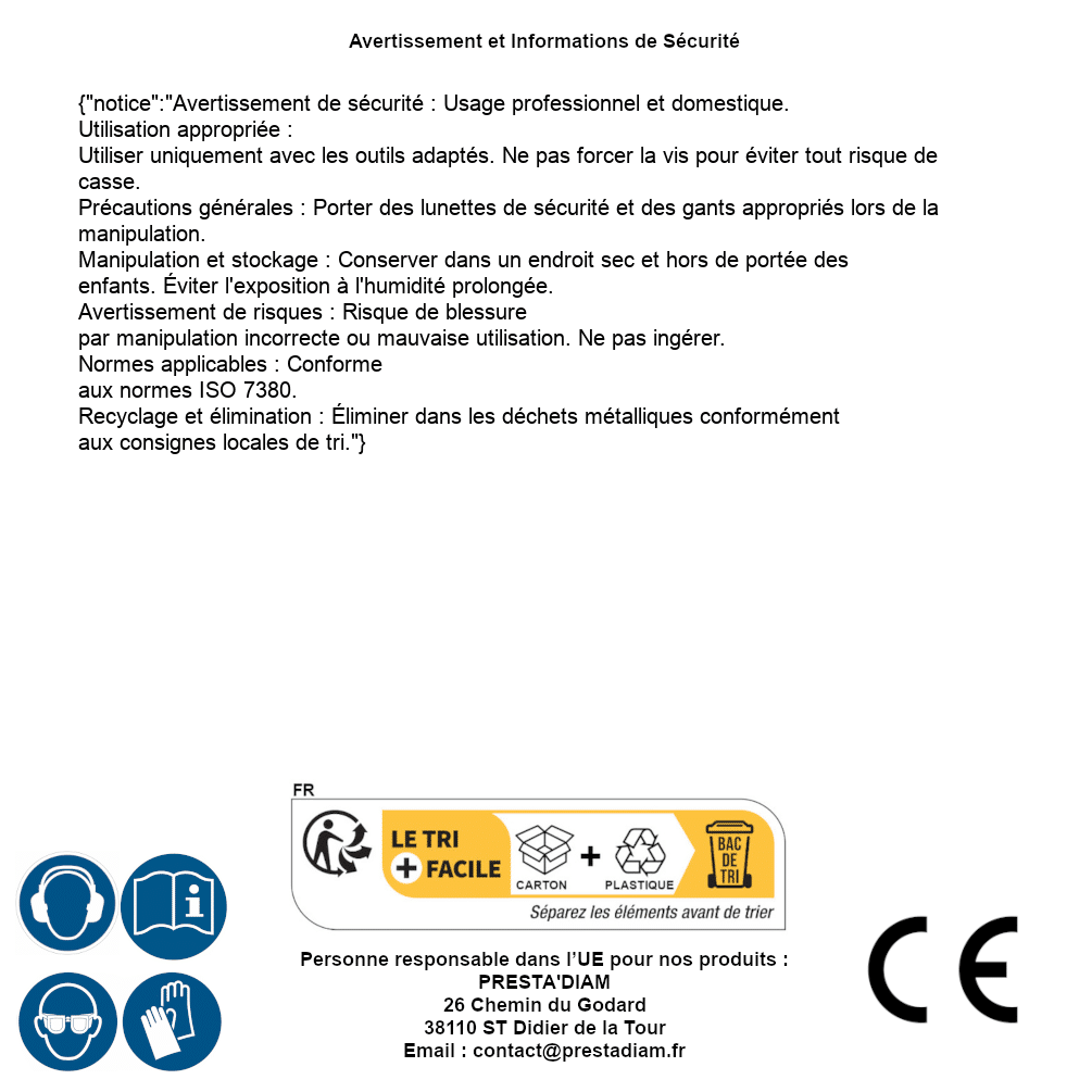 | WARNING and SAFETY | Identification de la personne responsable dans l’UE : Nom : PRESTA'DIAM. Adresse : 26 Chemin du Godard, 38110 ST Didier de la Tour (France). Email : contact@prestadiam.fr. |