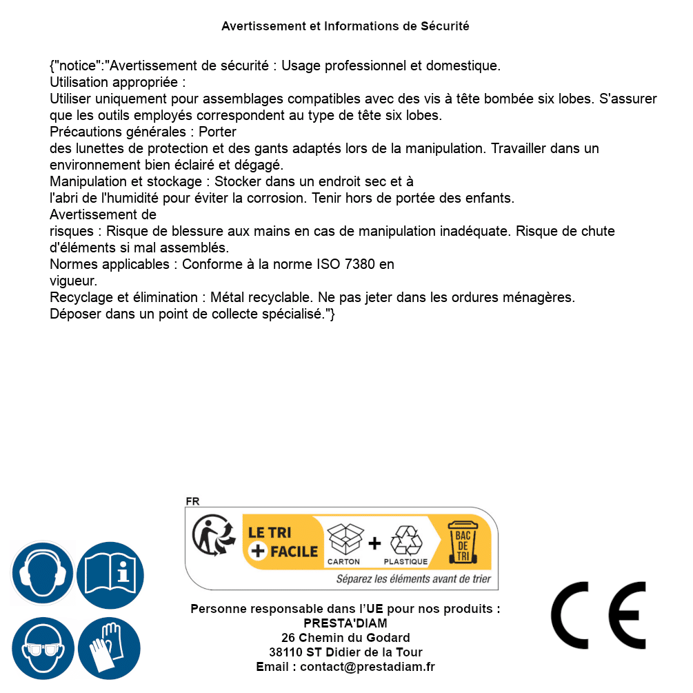 | WARNING and SAFETY | Identification de la personne responsable dans l’UE : Nom : PRESTA'DIAM. Adresse : 26 Chemin du Godard, 38110 ST Didier de la Tour (France). Email : contact@prestadiam.fr. |
