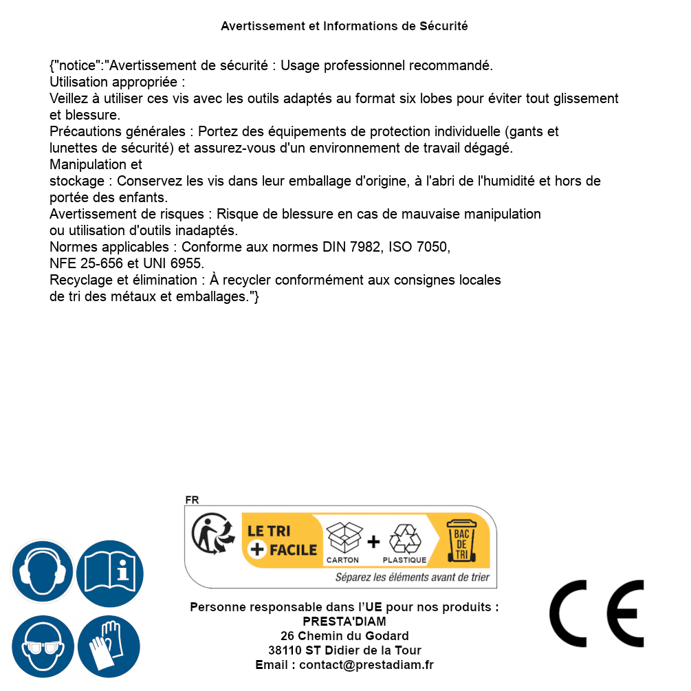 | WARNING and SAFETY | Identification de la personne responsable dans l’UE : Nom : PRESTA'DIAM. Adresse : 26 Chemin du Godard, 38110 ST Didier de la Tour (France). Email : contact@prestadiam.fr. |