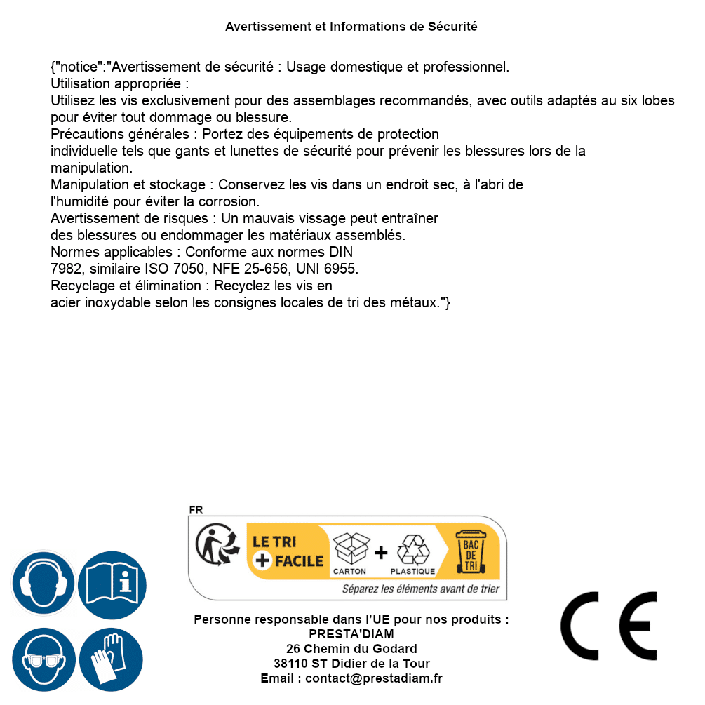 | WARNING and SAFETY | Identification de la personne responsable dans l’UE : Nom : PRESTA'DIAM. Adresse : 26 Chemin du Godard, 38110 ST Didier de la Tour (France). Email : contact@prestadiam.fr. |