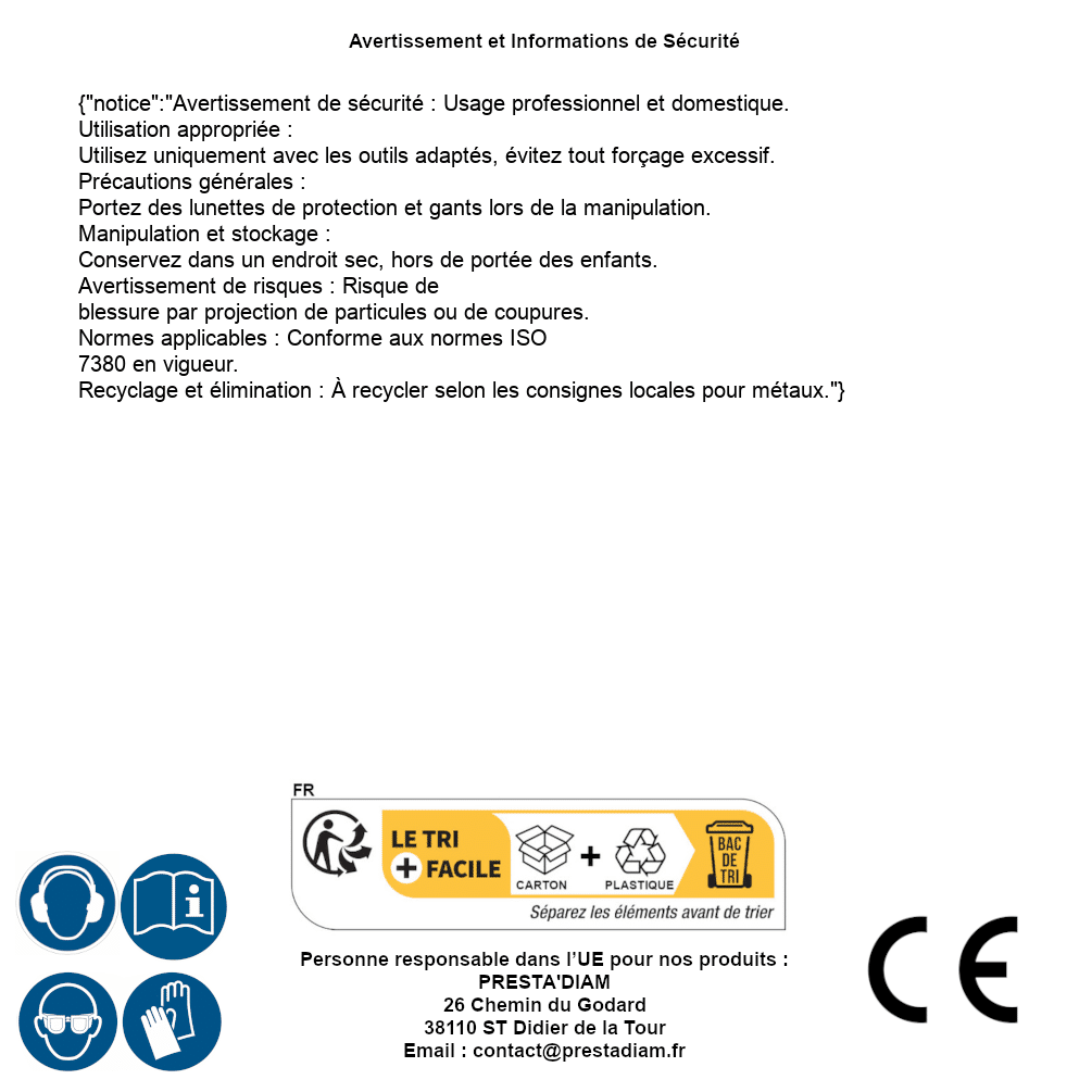 | WARNING and SAFETY | Identification de la personne responsable dans l’UE : Nom : PRESTA'DIAM. Adresse : 26 Chemin du Godard, 38110 ST Didier de la Tour (France). Email : contact@prestadiam.fr. |