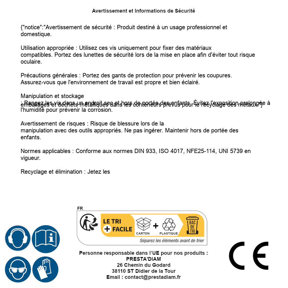 | WARNING and SAFETY | Identification de la personne responsable dans l’UE : Nom : PRESTA'DIAM. Adresse : 26 Chemin du Godard, 38110 ST Didier de la Tour (France). Email : contact@prestadiam.fr. |